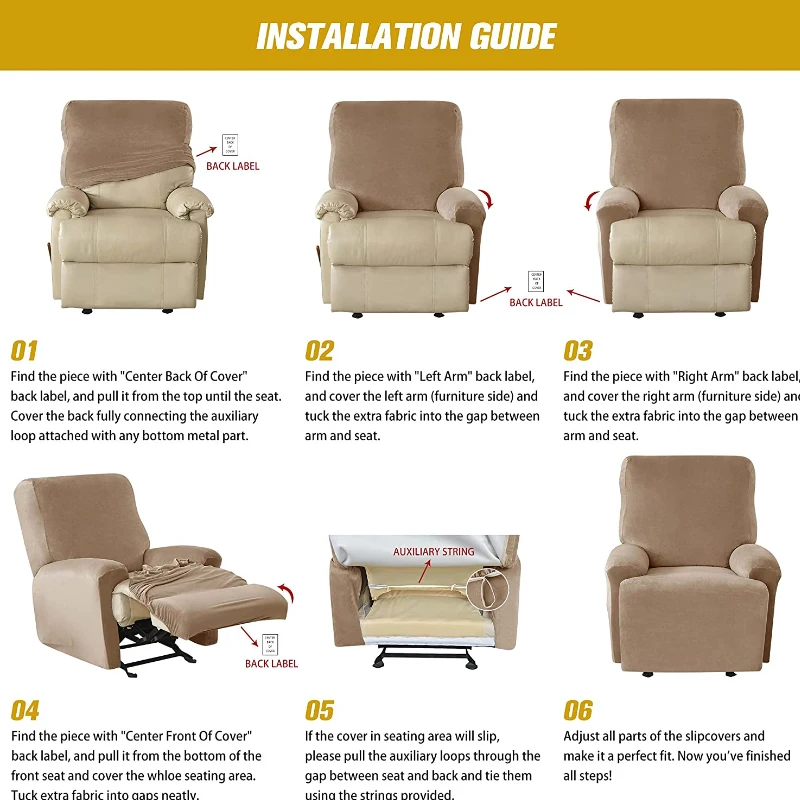 Unique design: manual recliner cover adds elastic belts at the back corner of the seat and the armrest, which enhances the anti-slip performance of the recliner cover, keeping the cover in place without moving. Our products come in a variety of colors. You can choose the color you want from us With full coverage design, it can protect daily stains, scuffs and kids' naughty drawing, as well as cat scratch, dog bites and furs if you have an energetic pet in your house. Great choice to fabric and leather recliner, ideal for homes with kids and pets.